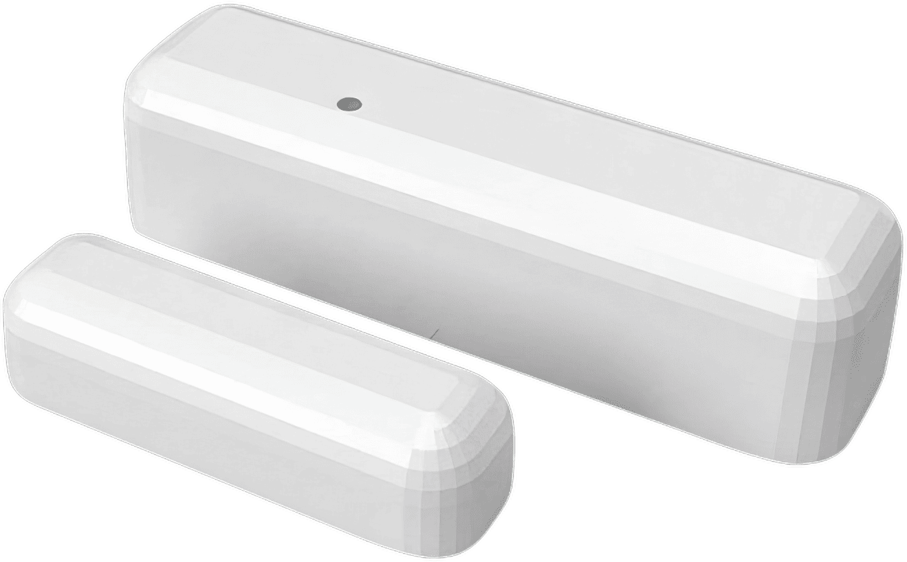 The Shelly Door Window 2 sensor. It consists of two parts: one contains the electronics, the other a magnet. Both are enclosed in a white plastic case.